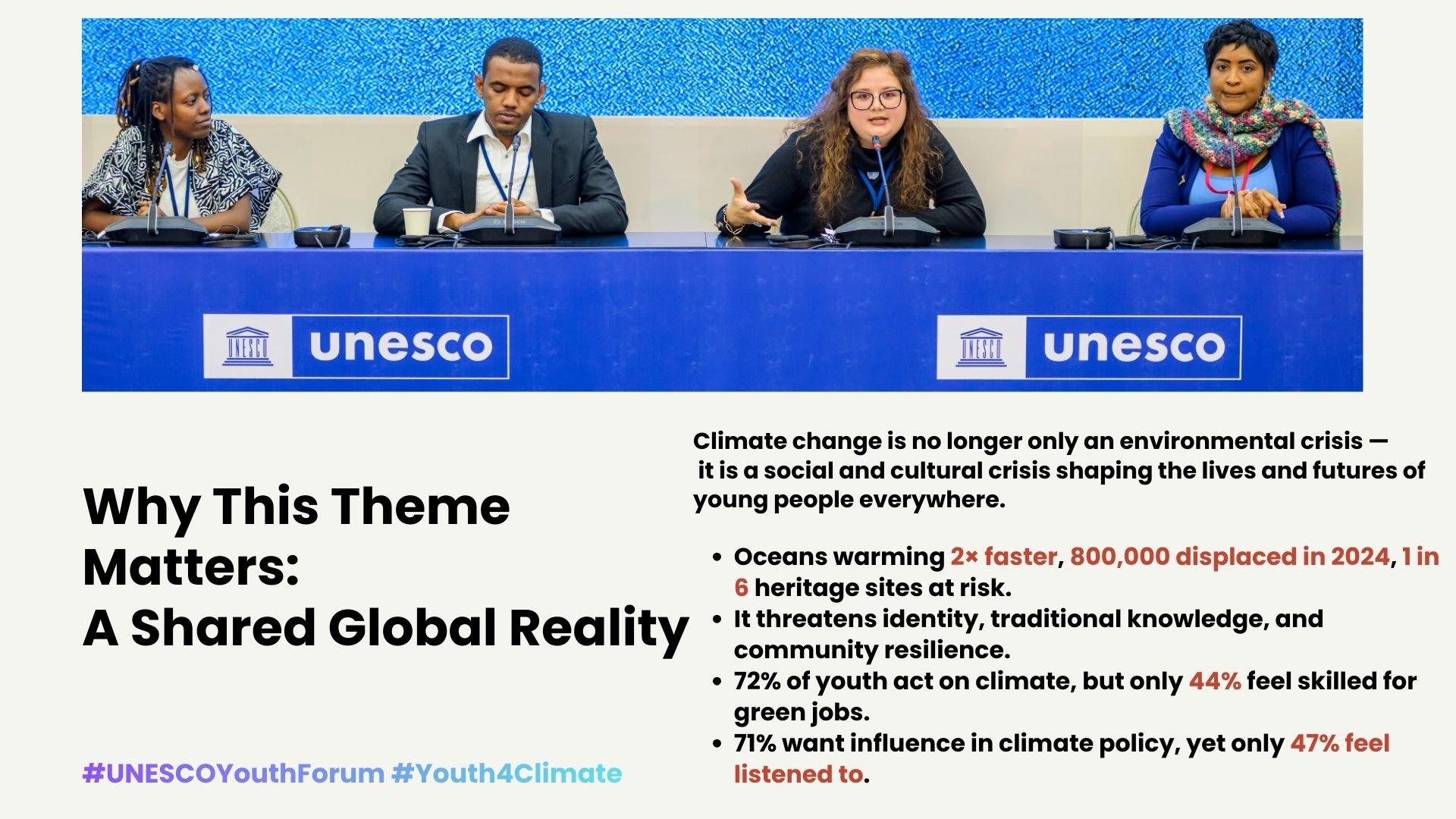 Το Forum πραγματοποιήθηκε υπό το θέμα «Climate Action and its Social Impacts on Youth», αναδεικνύοντας την ανάγκη κατανόησης της κλιματικής κρίσης όχι μόνο ως περιβαλλοντικής πρόκλησης, αλλά και ως κοινωνικής και πολιτιστικής πραγματικότητας που επηρεάζει άμεσα τις ζωές και το μέλλον των νέων.